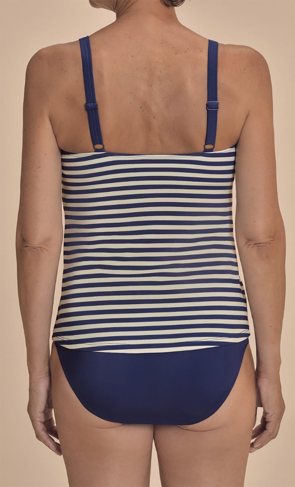 En Cassoria tankini top med lomme er klassisk mørkeblå/navy med off-white stribe.